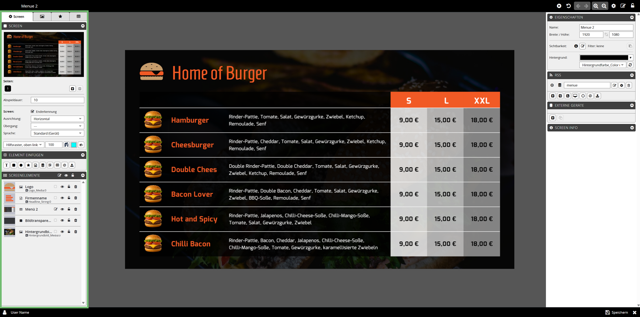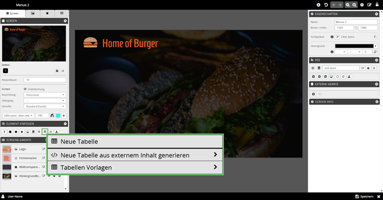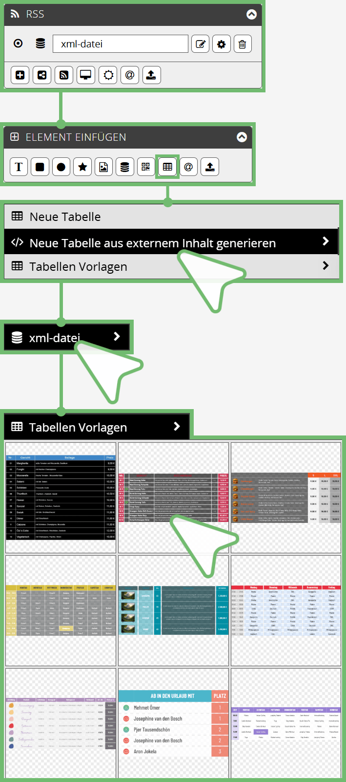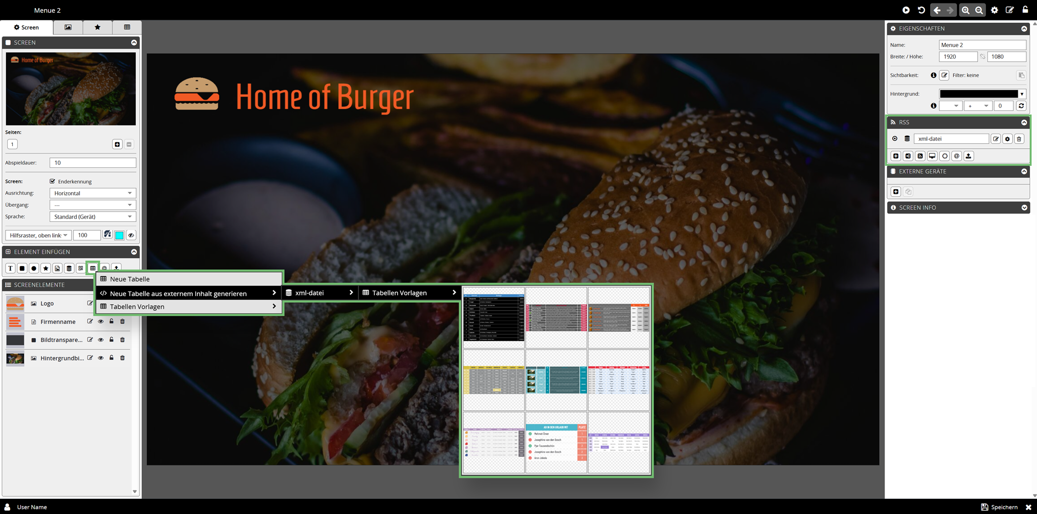 Diese Funktion schlägt Ihnen verschiedene Tabellen Vorlagen vor. Das ausgewählte Layout wird dem Screen Design Bereich inklusive aller vorkonfigurierten Inhalte hinzugefügt. Gleichzeitig wird dem Reiter Screenelemente ein neues Tabellenelement und dem Reiter RSS eine XML-Datei (Externer Inhalt) mit allen Tabelleninhalten und Farben hinterlegt.