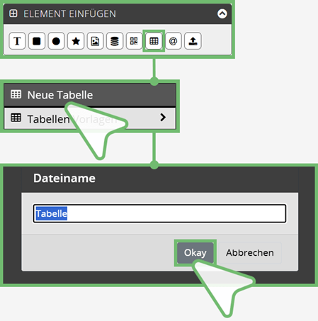 | → | | Geben Sie der neuen Tabelle im Overlay-Fenster einen Namen und bestätigen Sie mit Okay |