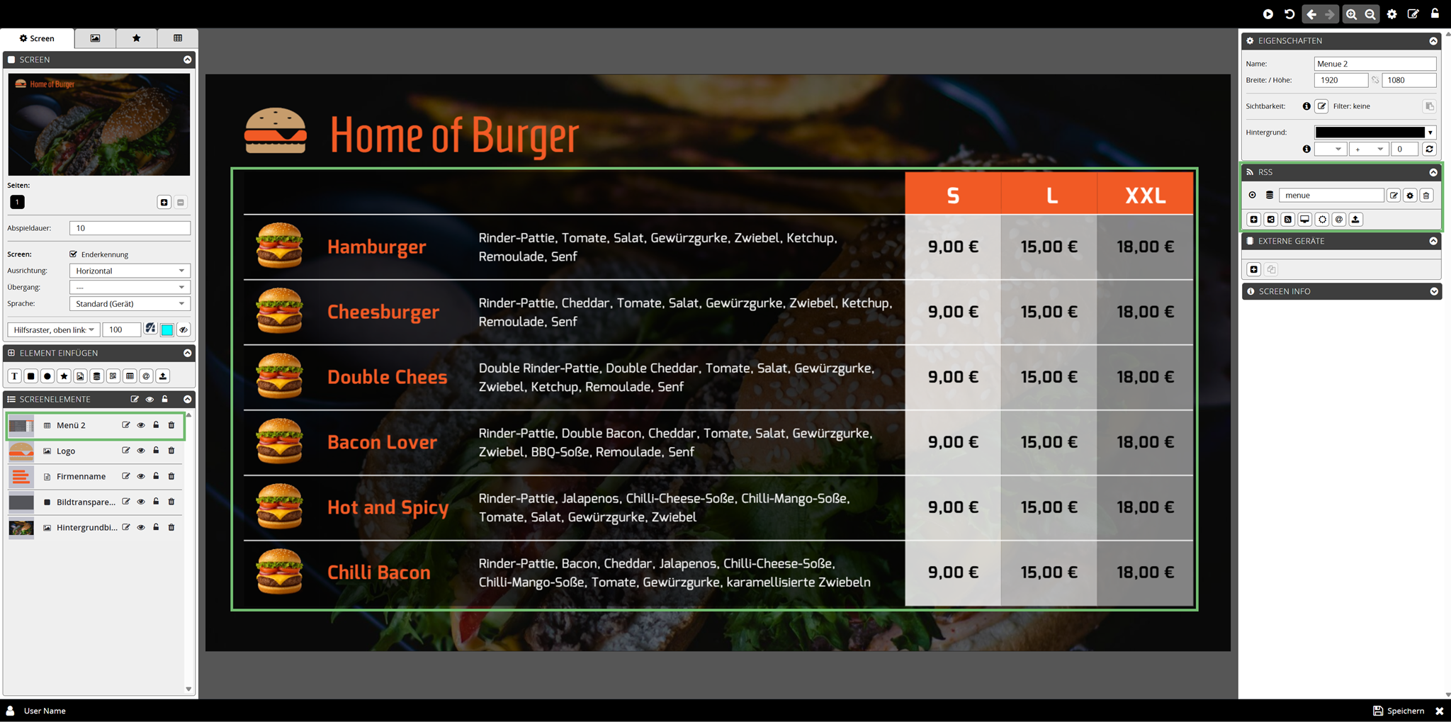 Gleichzeitig wird dem Reiter Screenelemente ein neues Tabellenelement und dem Reiter RSS eine XML-Datei (Externer Inhalt) mit allen Tabelleninhalten und Farben hinterlegt.