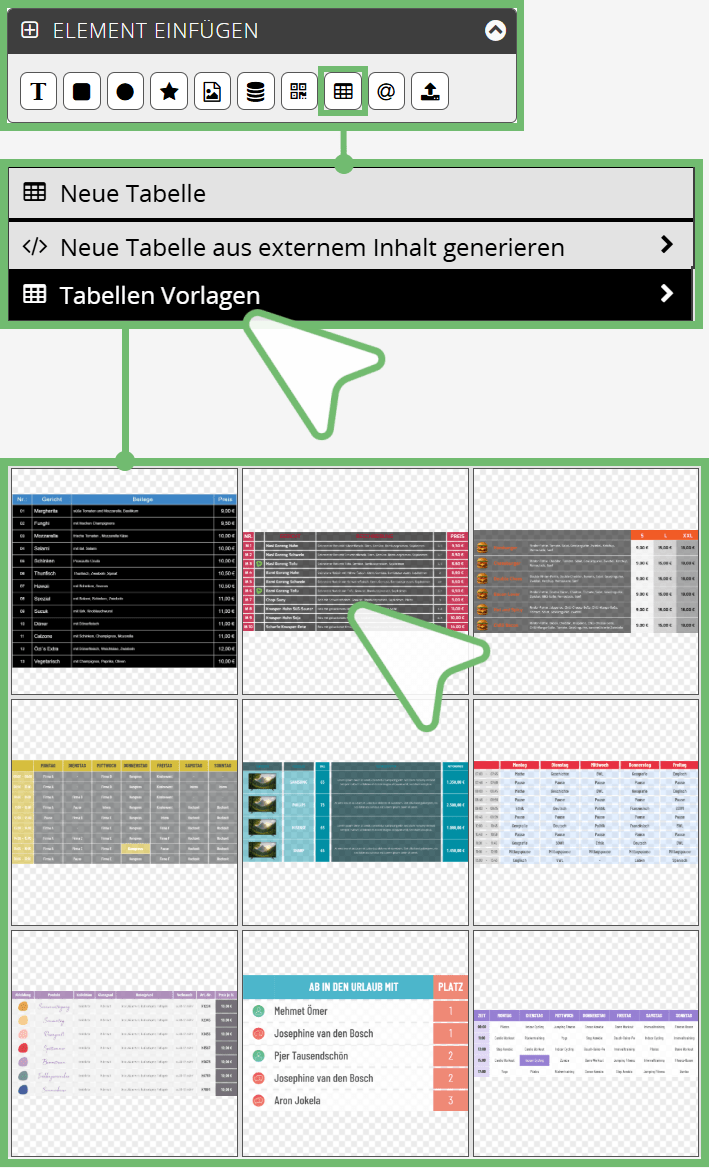 | → | | Gehen Sie im Popup Menü zu Tabellen Vorlagen |