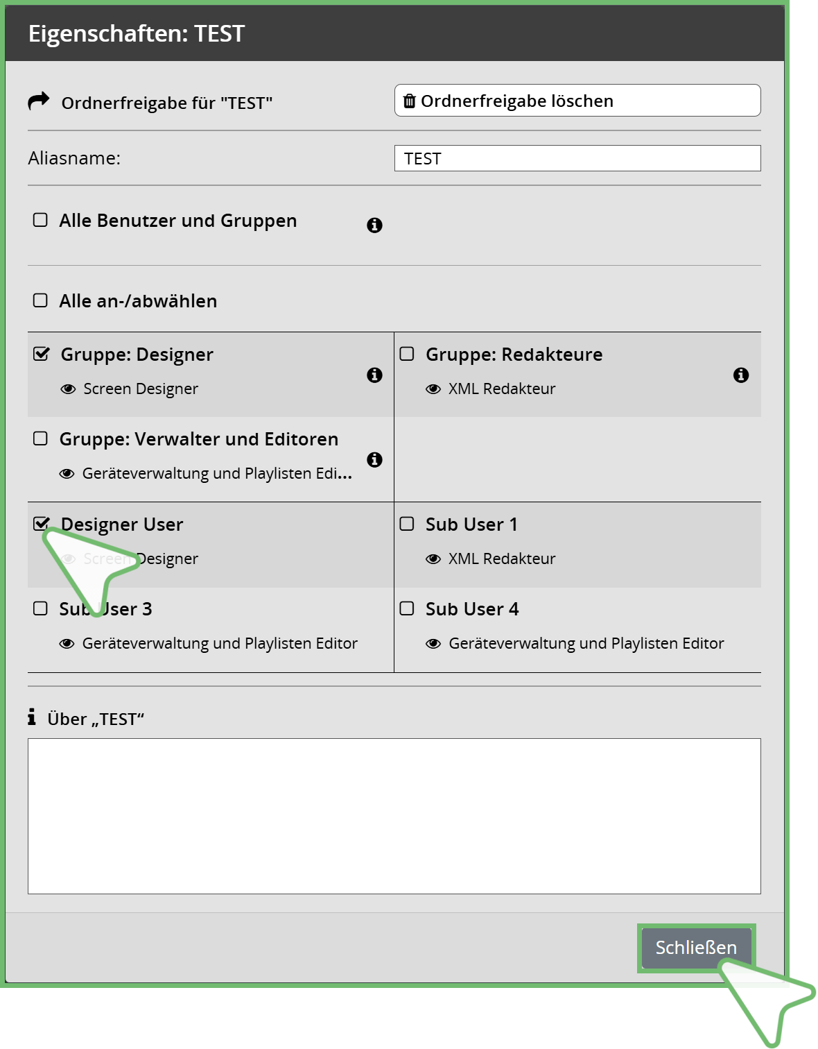 Lesen Sie dazu auch das Unterkapitel → Medien | Odnerfreigaben verwalten unter Benutzer.