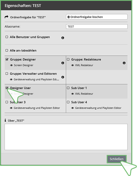 | Es öffnet ein Overlay-Fenster, über das Sie den Ordner für die angezeigten Nutzer und Gruppen freigeben können | |
