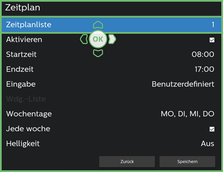 | Drücken Sie die OK-Taste, um Zeitplan 1 zu aktivieren. | |