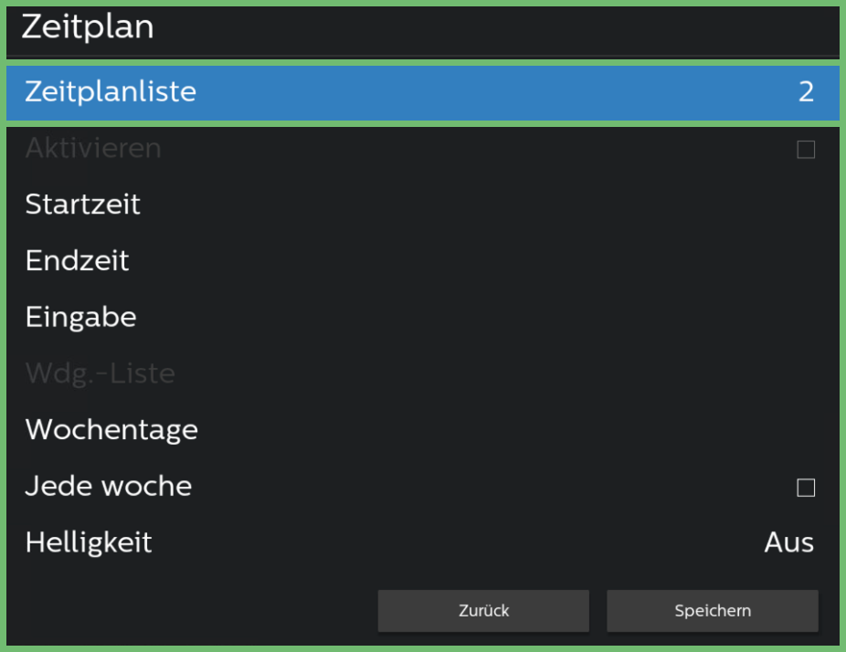 | Sie benötigen die Menüpunkte Startzeit, Endzeit und Wochentage. |