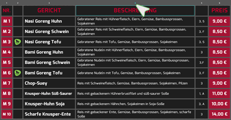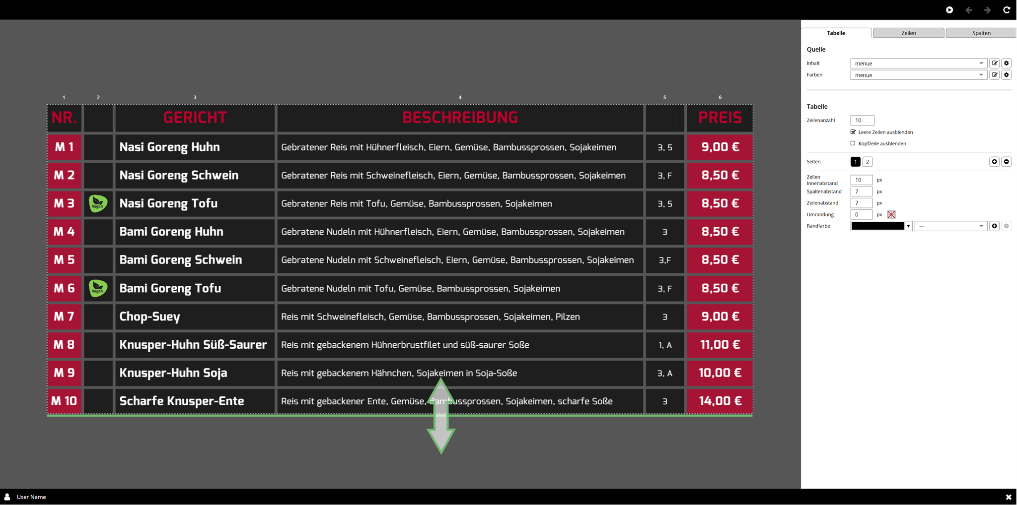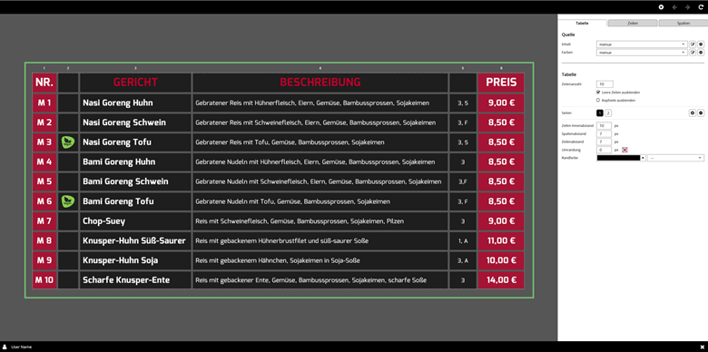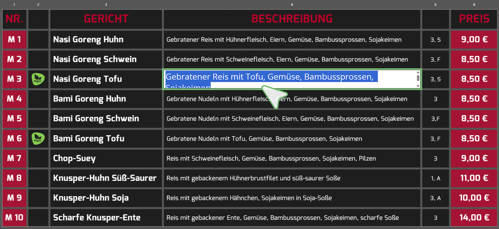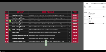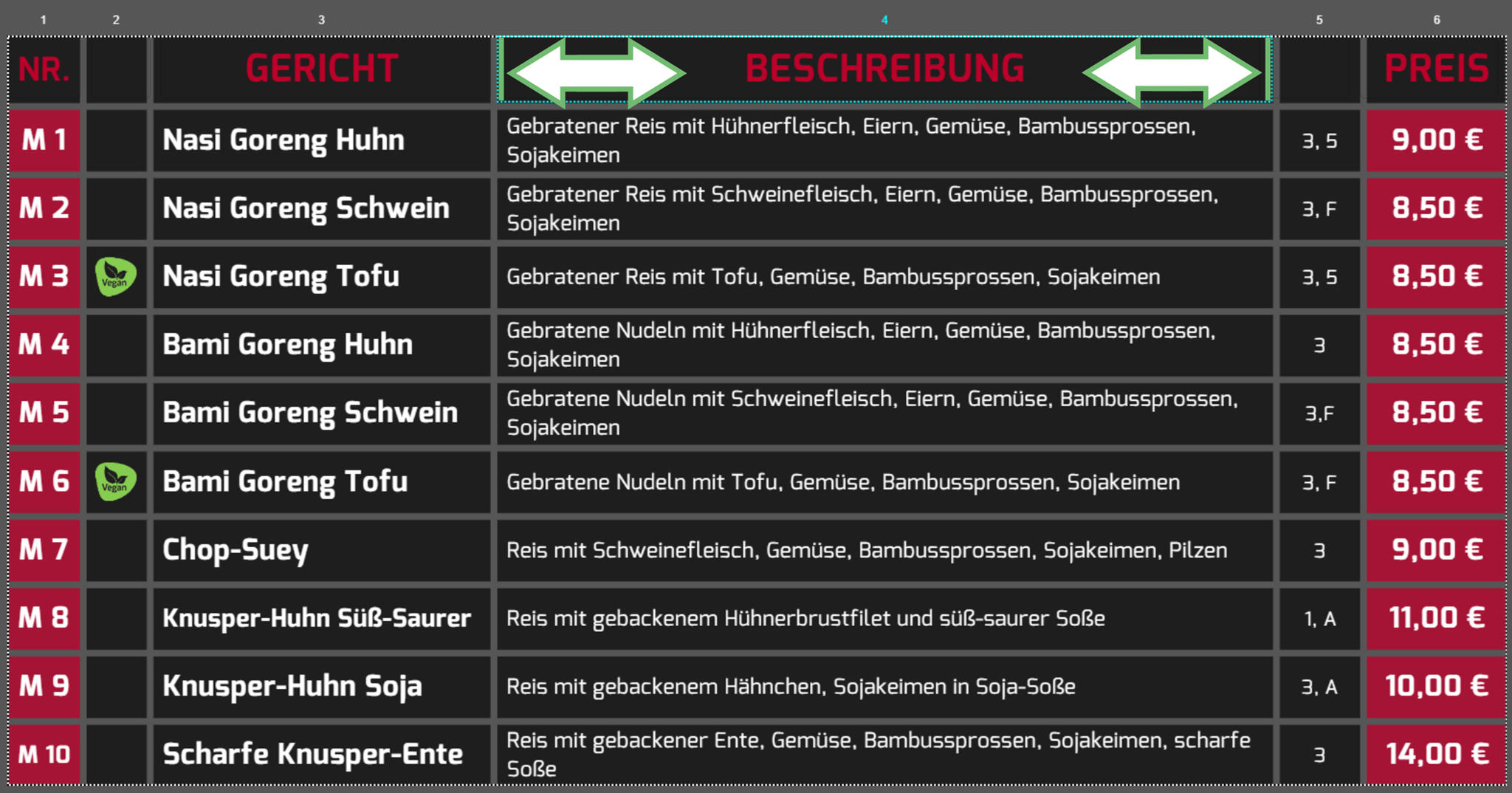 ![]() | LINKE FENSTERSEITE - Tabelle in Breite und Höhe anpassen - Spalte auswählen - Spalte in Breite und Höhe anpassen - Text- und Bildinhalte ändern - Zeilen bearbeiten - Kontextmenü |
