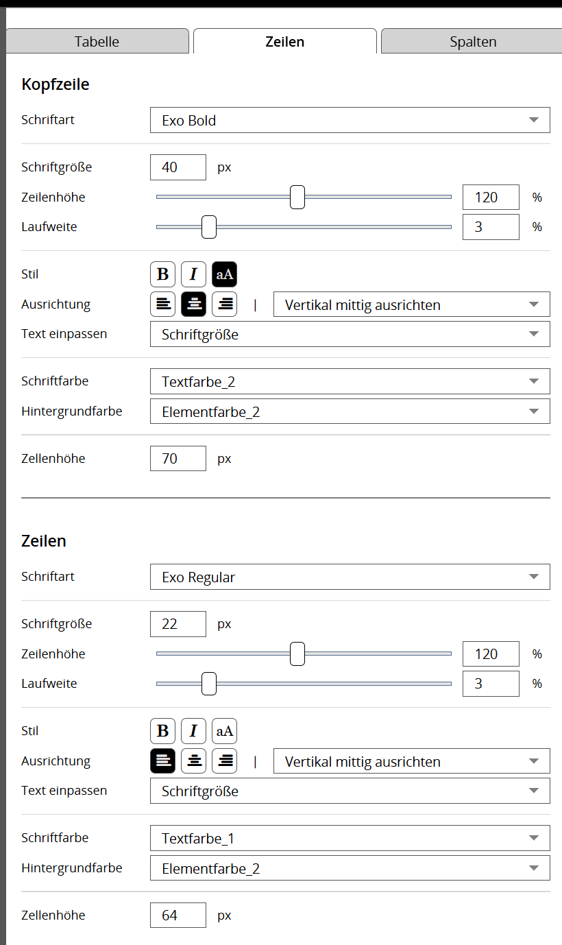 Für beide Zeilenbereiche können detaillierte Schrifteinstellungen,