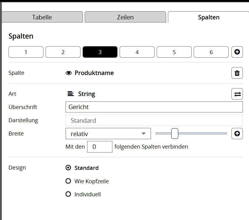 Zeileneinstellungen der Tabelle unterteilt in Kopfzeile und