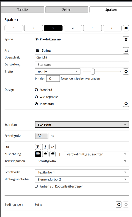 Bei den individuellen Einstellungen einer Spalte könnten wir dann auch unser Beispiel für „Bedingungen“ hinzufügen –
