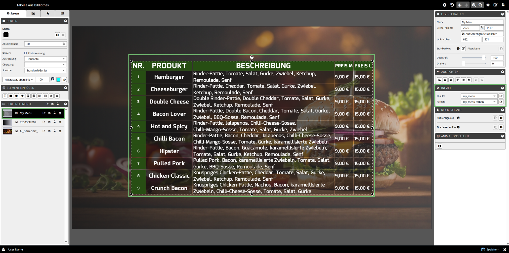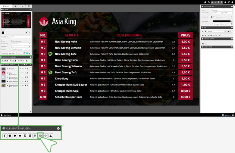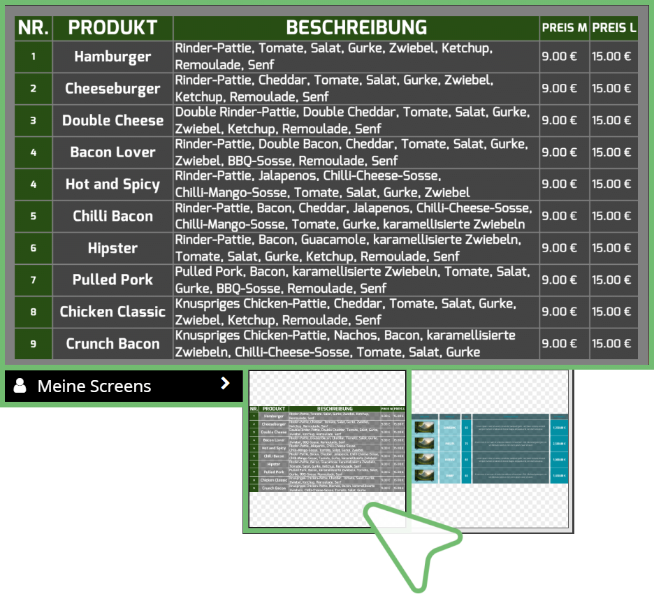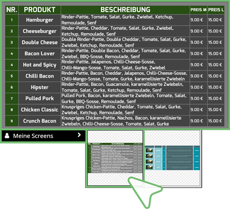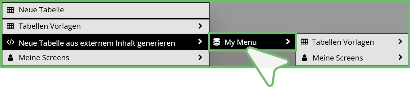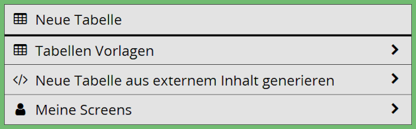 | 4 | Meine Screens Fügt eine Tabelle aus Ihrer Bibliothek | Ordner MEINE SCREENS ein – dieser Menüpunkt wird angezeigt, sobald eine Tabelle in Ihrer Bibliothek gespeichert ist |