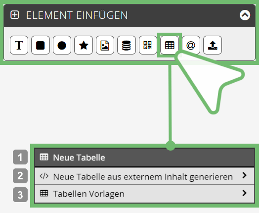 | Zum Erstellen einer Tabelle finden Sie unter dem Reiter Element einfügen den Button | ||
