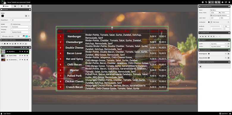 | 3 | Neue Tabelle aus externem Inhalt generieren Fügt eine Tabelle mit Inhalten aus einer eigenen externen XML-Datei ein – dieser Menüpunkt wird angezeigt, sobald der Screen ist mit einer XML-Datei verlinkt ist |