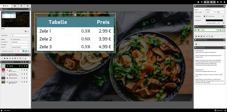 | → | | Ebenso finden Sie im Reiter Screenelemente ein neues Screenelement Tabelle mit dem Namen der in der Tabellen Vorlage hinterlegten externen Inhaltsdatei |