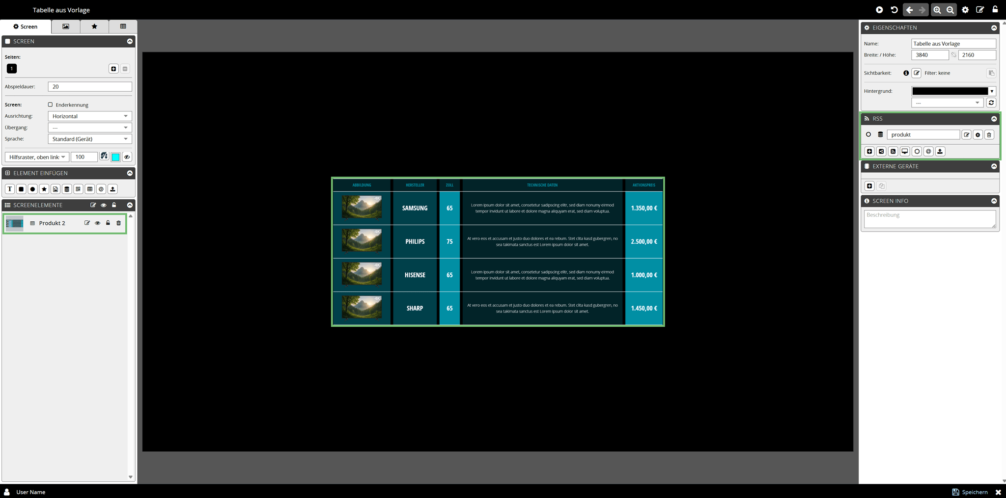 | Im Reiter Screenelemente erscheint ein neues Screenelement Tabelle mit dem Namen der in der Tabellen Vorlage hinterlegten externen Inhaltsdatei | |
