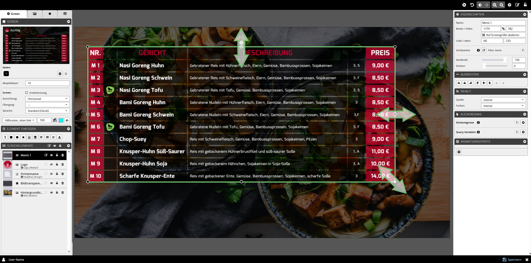 Im Bereich Screen Design kann die Größe der Tabelle proportional skaliert oder unproportional in der Breite und Höhe skaliert werden.