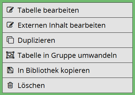 Externen Inhalt bearbeiten — Öffnet die XML-Datei der Tabelle zur Anpassung der Inhalte