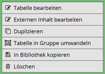 Der Rechtsklick auf die Tabelle öffnet die folgenden Optionen: