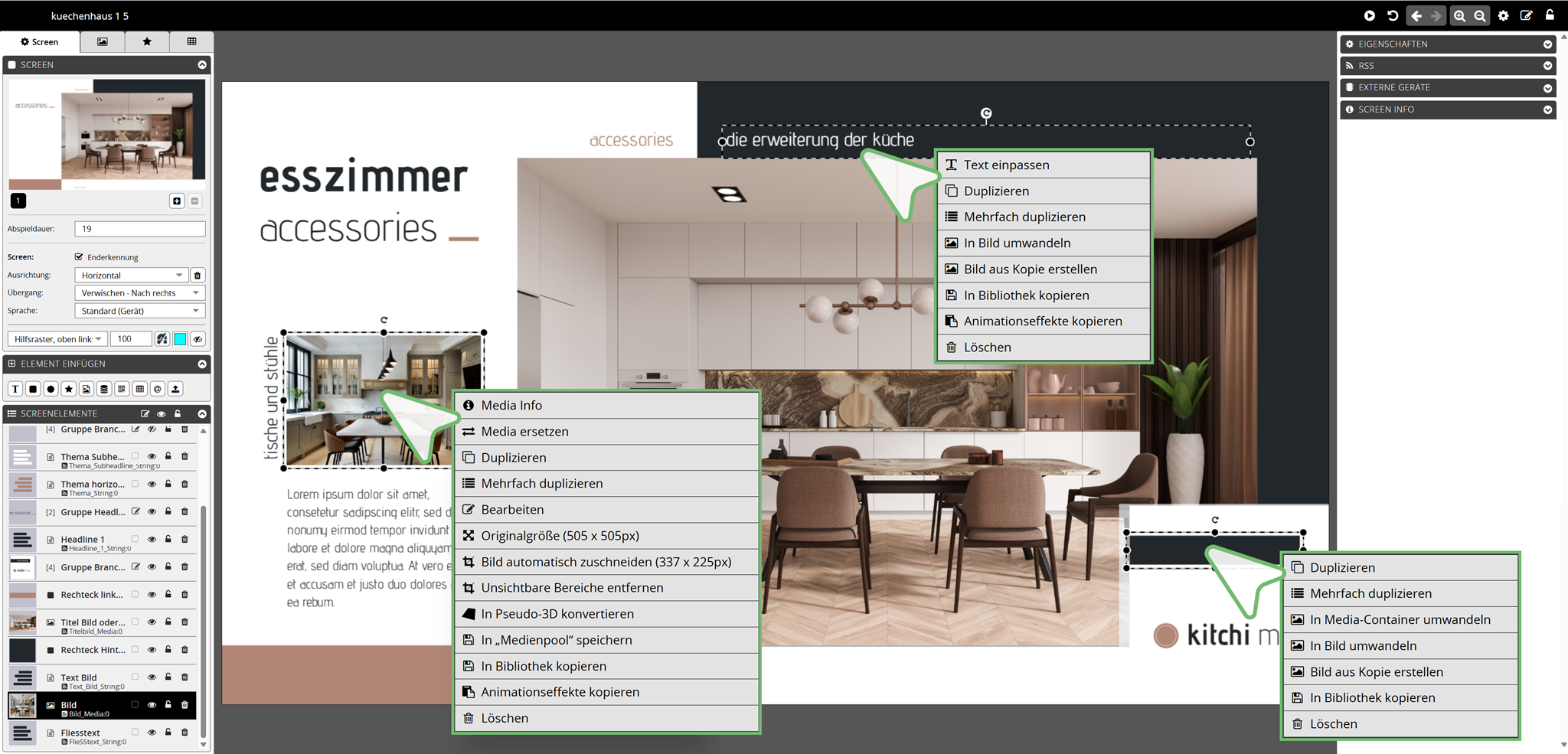 | | Media ersetzen Ein Overlay-Fenster verbindet Sie mit dem → Medienpool und ermöglicht den einfachen Medientausch | |
