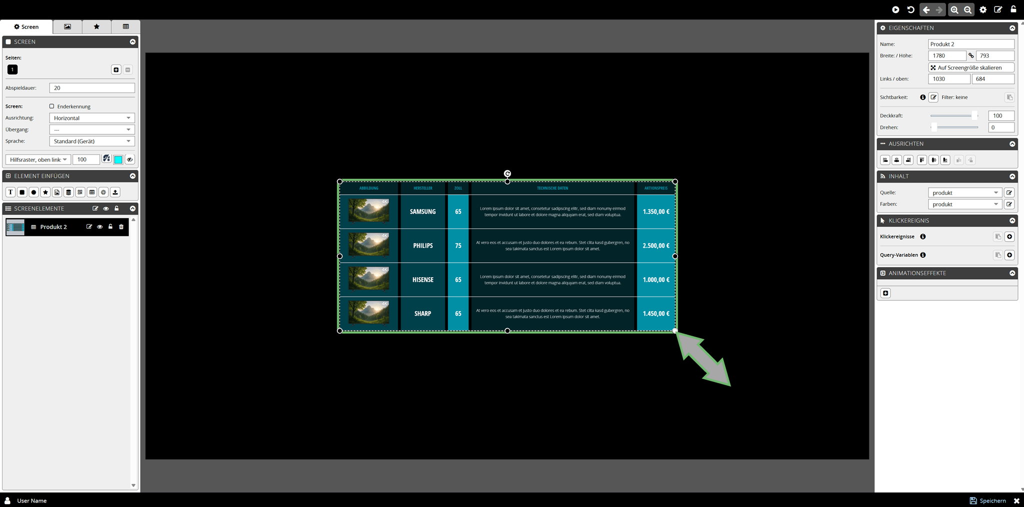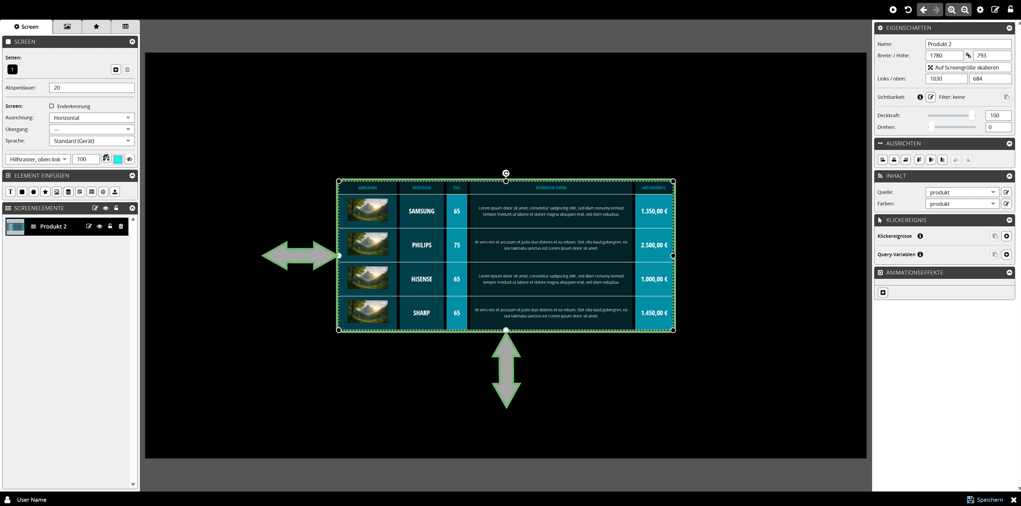 Innerhalb des Screen Design-Bereichs können Sie Tabellenelemente proportional oder unproportional skalieren.