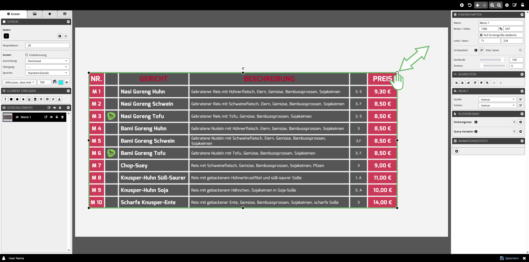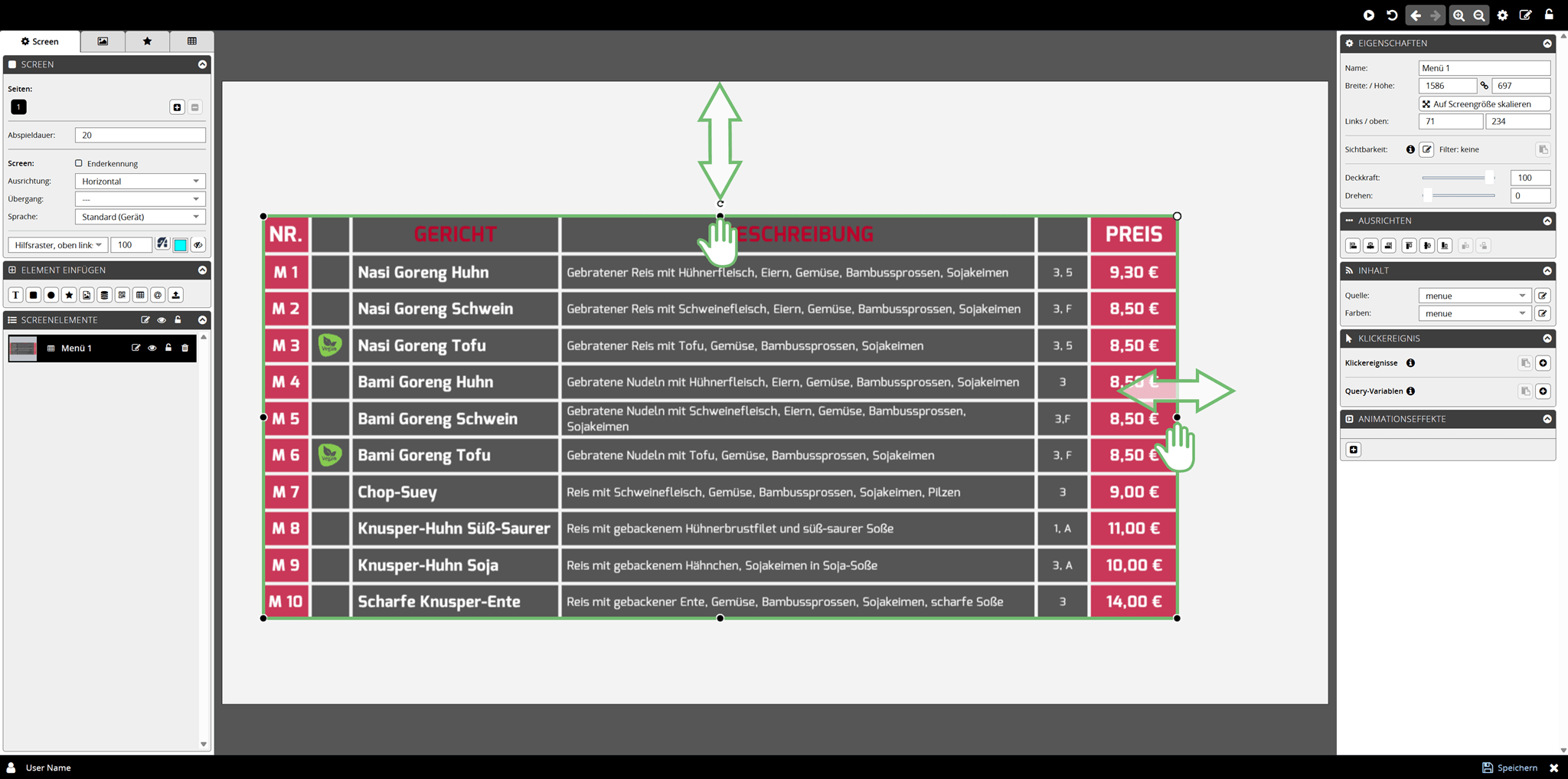 Innerhalb des Screen Design Bereichs können Sie Tabellenelemente proportional oder unproportional skalieren.