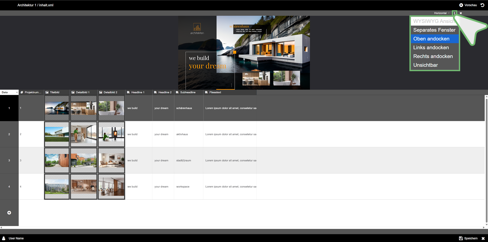 Sie können im XML Editor sowohl Zeilen → (siehe 1) und damit weitere Einträge hinzufügen, wie auch Spalten → (siehe 2) und damit weitere Datenfelder.